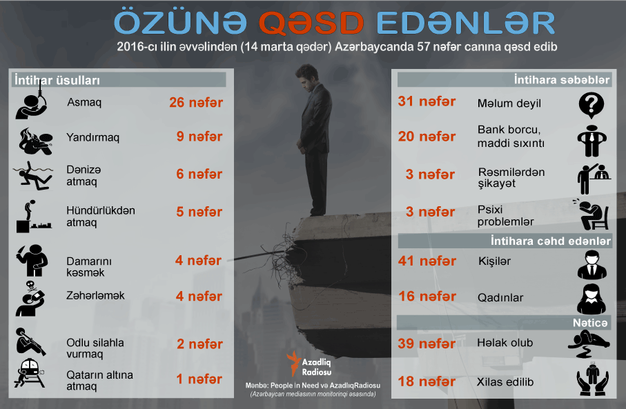 Azərbaycan mediasında xüsusilə ilin əvvəlindən az qala hər gün kiminsə özünü öldürməsi, intihara cəhdi haqqında məlumatlar yayır. Bakıdakı ekspertlər qurbanların son vaxtlar özlərinə qəsd üçün "Bank borcu", "Maddi imkansızlıq" səbəblərini daha çox gətirdiklərini deyirlər. Ekspertlər onu da əlavə edirlər ki, Azərbaycanda intiharların rəsmi statistikası aparılmır. Buna görə, intiharların sayında son vaxtlar hiss edilən tendensiyanın gerçək mənzərəsi - artması, yoxsa, azalması haqqında bir söz demək olmur. Medianın monitorinqi əsasında bu il yanvarın 1-dən martın 4-ə qədər Azərbaycanda özünəqəsdləri bir araya toplamışıq. Yaranan mənzərə aşağıdakı kimidir: