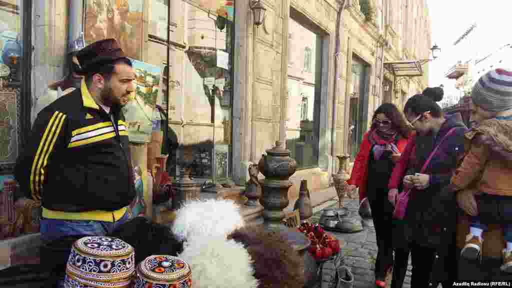 Başqa günlər Bakıda çox turist olmasa da, Novruz bayramına görə gələnlər var. Onlar da ilk öncə milli suvenirlərin satıldığı dükanlara üz tutur.