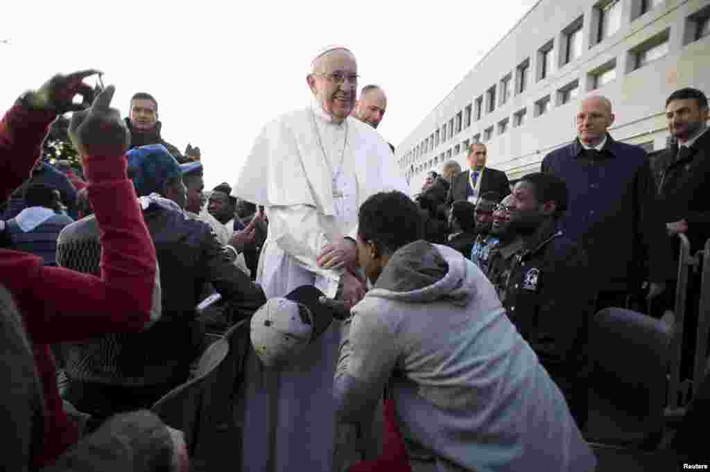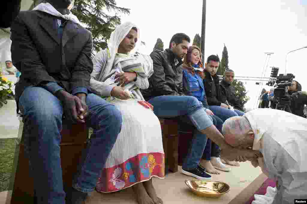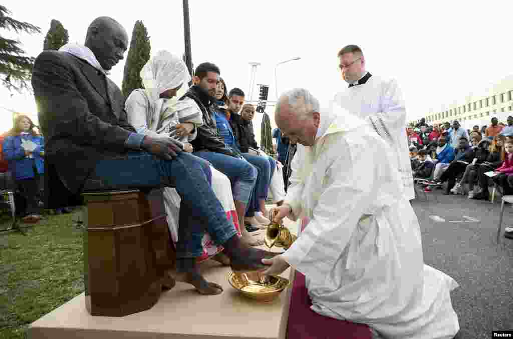 Papa Francis Roma yaxınlığındakı qaçqın düşərgəsində miqrantların ayağını yuma mərasimində iştirak edib. Onların bir qrupunun ayağını yuyaraq öpüb. 24 mart, 2016. Son 1 ildə Avropaya Suriya, İraq, Əfqanıstan və şimali Afrika ölkələrindən 1 milyonacan qaçqın gəlib. Avropa ölkələrinin onları qəbul edib-etməmək məsələsində mövqeləri haçalanır. Polşa isə Brüssel terrorundan sonra qaçqınları qəbul etməkdən imtina eləyib.