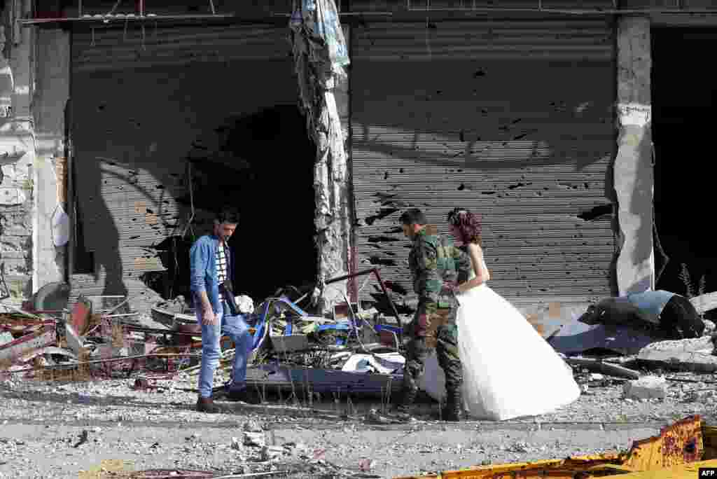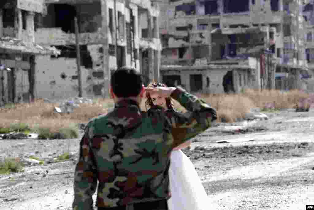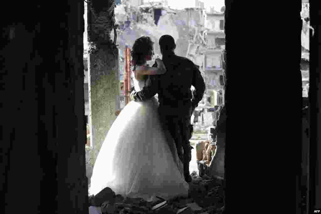 Ağır döyüşlərin dağıtdığı Homs şəhərində ailə quran 27 yaşlı Həsənlə 18 yaşlı Nadinin fotoları.