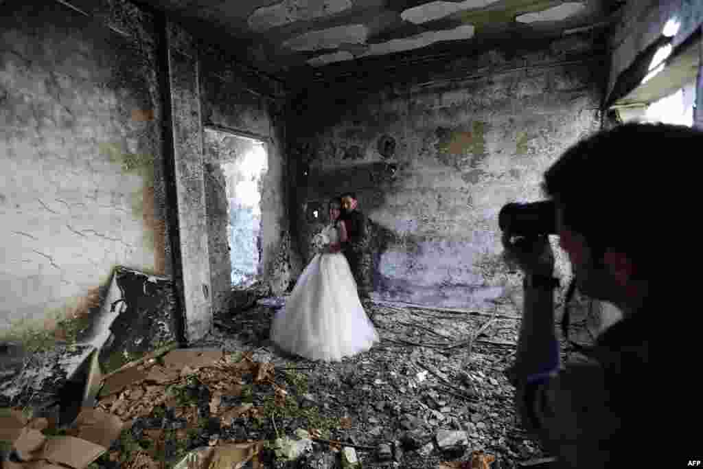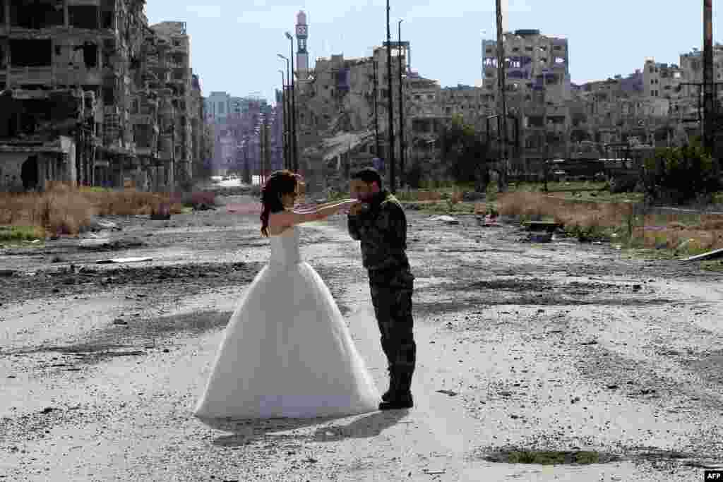 Ağır döyüşlərin dağıtdığı Homs şəhərində ailə quran 27 yaşlı Həsənlə 18 yaşlı Nadinin fotoları.
