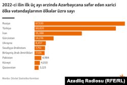 Dövlət Statistika Komitəsinin (DSK) məlumatına görə, 2022-ci ilin ilk üç ayı ərzində Azərbaycana toplam 246 min 217 nəfər əcnəbi və ya vətəndaşlığı olmayan şəxs səfər edib. Onların 164 min nəfəri turizm (67 faiz), 82 min nəfəri (33 faiz) digər məqsədlərlə gəlib. Digər məqsədlə səfər edənlərə sərhəd işçiləri, mövsümi işləməyə gələnlər, eləcə də qısa və ya uzunmüddətli işləməyə gələnlər, köçərilər, ictimai nəqliyyat vasitələrinin heyəti, təhsil alanlar və onlarla birlikdə yaşayan ailə üzvləri və b. aiddir. Metodologiyaya görə, onlar turist sayılmırlar. Bu il ölkəyə gələn əcnəbi sayının ötən illərlə müqayisəsi göstərir ki, 2021-ci ilin ilk üç ayıyla müqayisədə ölkəyə gələnlərin sayı iki dəfəyə yaxın artıb. Amma pandemiyanın başladığı 2020-ci illə müqayisədə bu il Azərbaycana səfər edənlərin sayı hələ də iki dəfədən çox azdır.